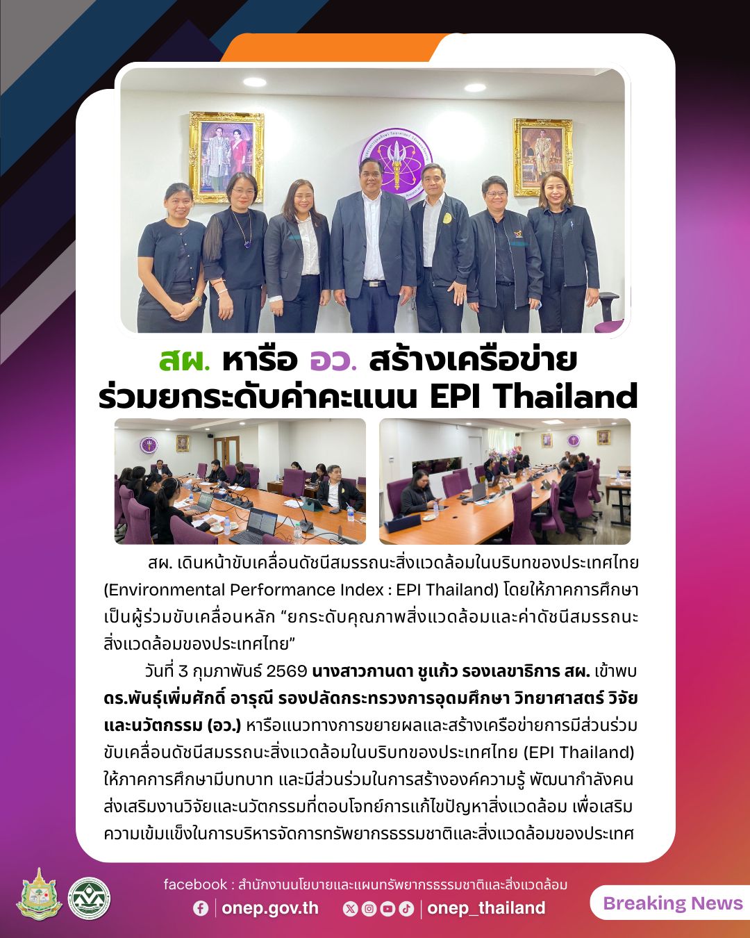 วันที่ ๓ กุมภาพันธ์ ๒๕๖๙ นางสาวกานดา ชูแก้ว รองเลขาธิการ สผ. เข้าพบดร.พันธุ์เพิ่มศักดิ์ อารุณี รองปลัดกระทรวงการอุดมศึกษา วิทยาศาสตร์ วิจัยและนวัตกรรม (อว.) หารือแนวทางการขยายผลและสร้างเครือข่ายการมีส่วนร่วมขับเคลื่อนดัชนีสมรรถนะสิ่งแวดล้อมในบริบทของประเทศไทย (EPI Thailand) เพื่อให้ภาคการศึกษามีบทบาท และมีส่วนร่วมในการสร้างองค์ความรู้ พัฒนากำลังคน ส่งเสริมงานวิจัยและนวัตกรรมที่ตอบโจทย์การแก้ไขปัญหาสิ่งแวดล้อม เพื่อเสริมความเข้มแข็งในการบริหารจัดการทรัพยากรธรรมชาติและสิ่งแวดล้อมของประเทศ